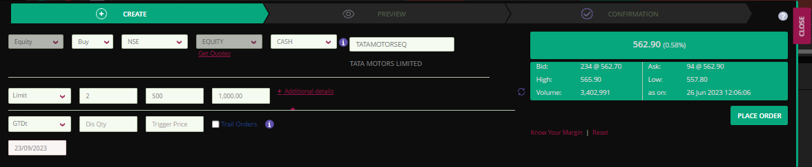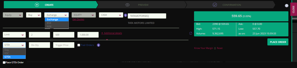 2. While placing the order(BUY/SELL): Click on the 'GTDt dropdown' and then select the validity date of your choice as shown in the images below