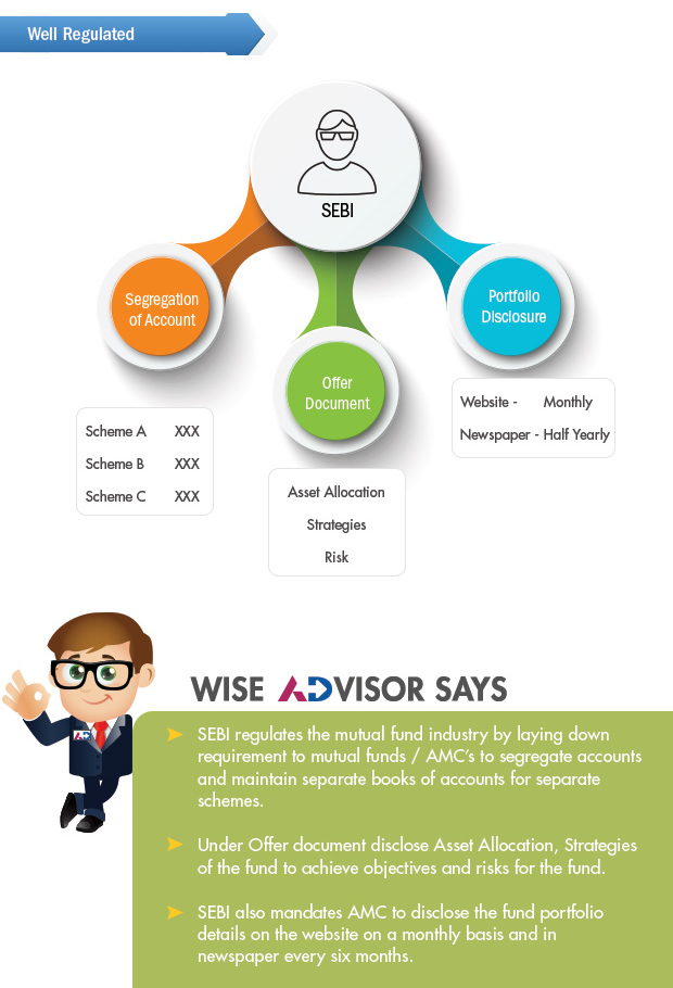 All mutual fund houses are registered with the Securities and Exchange Board of India (SEBI). Furthermore, they must follow and adhere to strict regulatory guidelines and rules that are provided for investor protection. Mutual Fund industry is well regulated and SEBI is the regulator for this industry. The regulator mandates about critical information of the scheme to be published e.g. Net Asset Value, expense ratio, fund managers managing their funds etc.