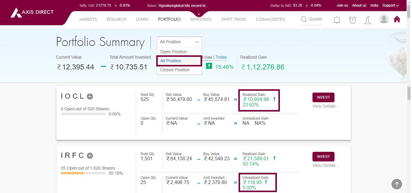 To view the Profit and Loss of all your Positions, you need to change the view of the Portfolio Summary Page to 'All Positions' from the dropdown given next to 'Portfolio Summary' as shown in the image below: