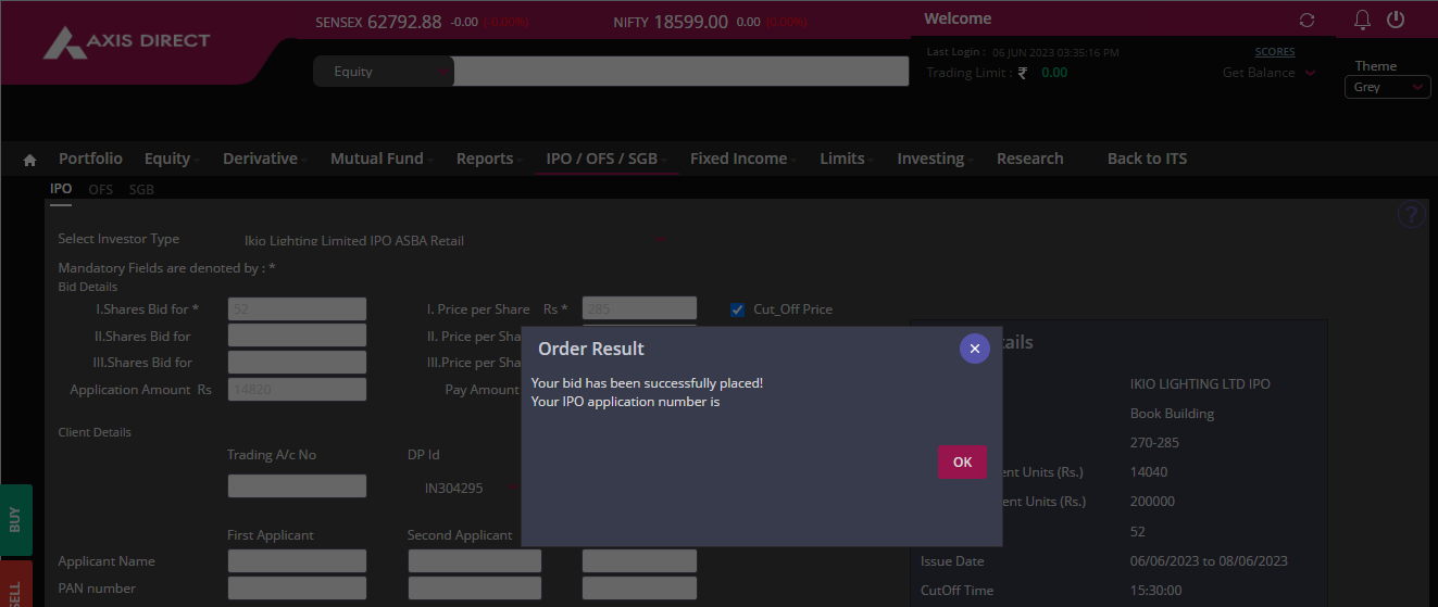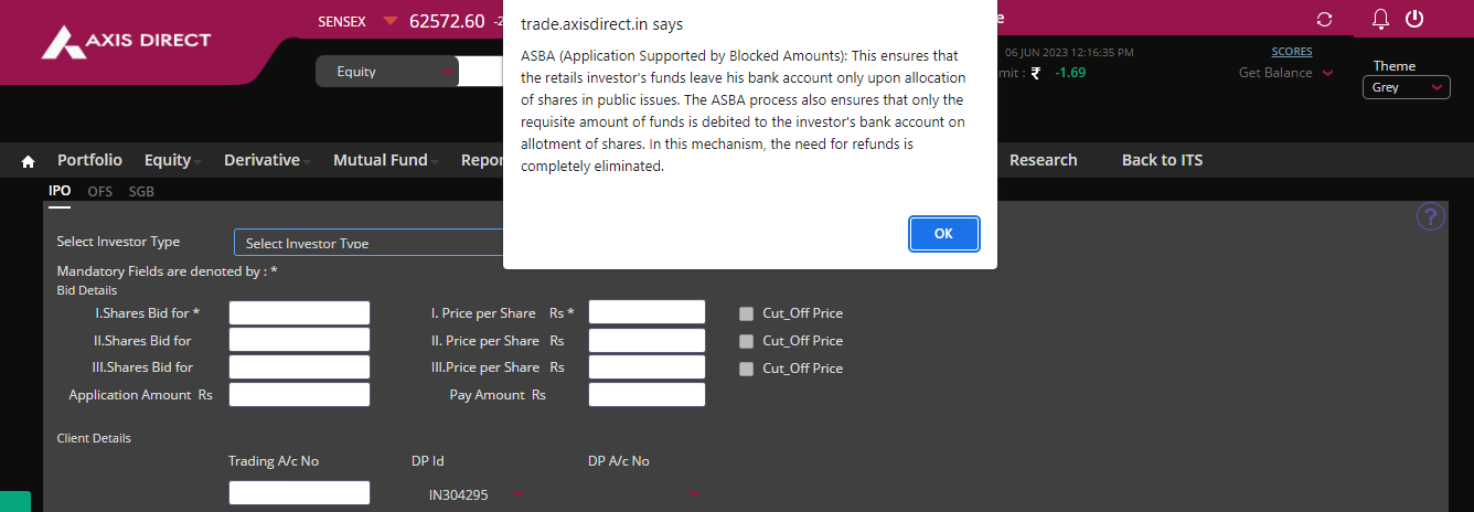 Step 5: An ASBA notification would pop up as soon as you select the Investor type, click on ‘OK’ to proceed