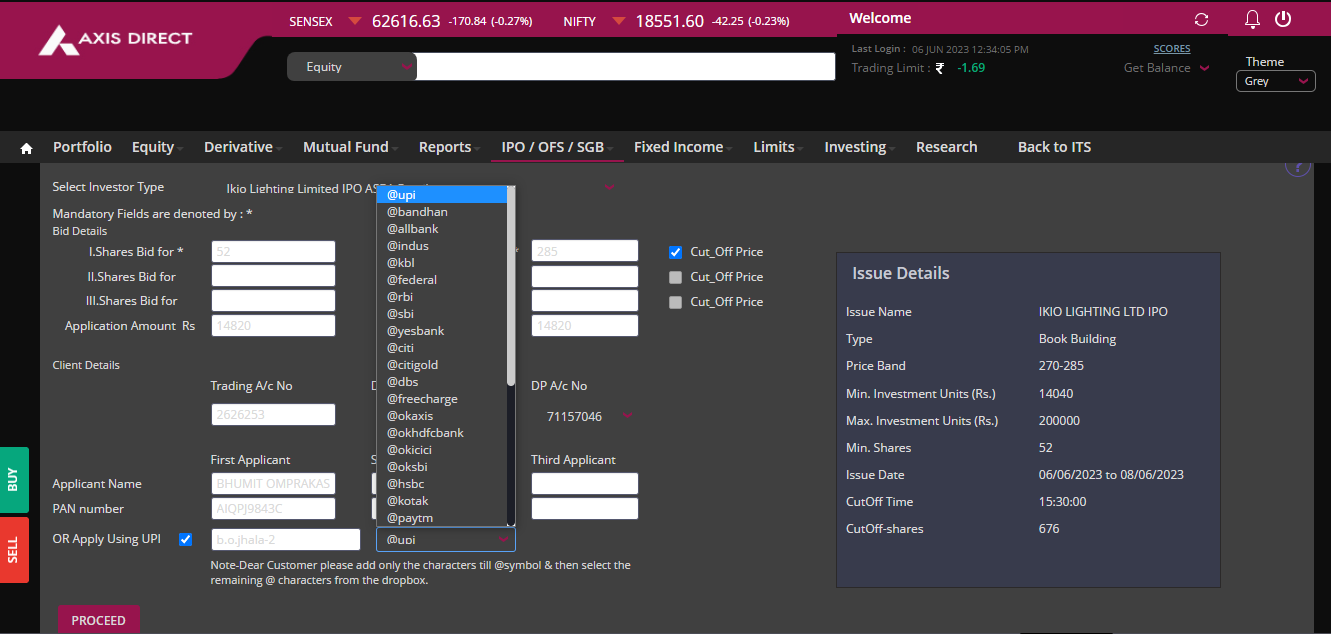 Step 6: Fill in the required details for the order such as the desired bid quantity, the desired bid price, on this screen you have the option to apply for the IPO through UPI or through the ASBA mode.
