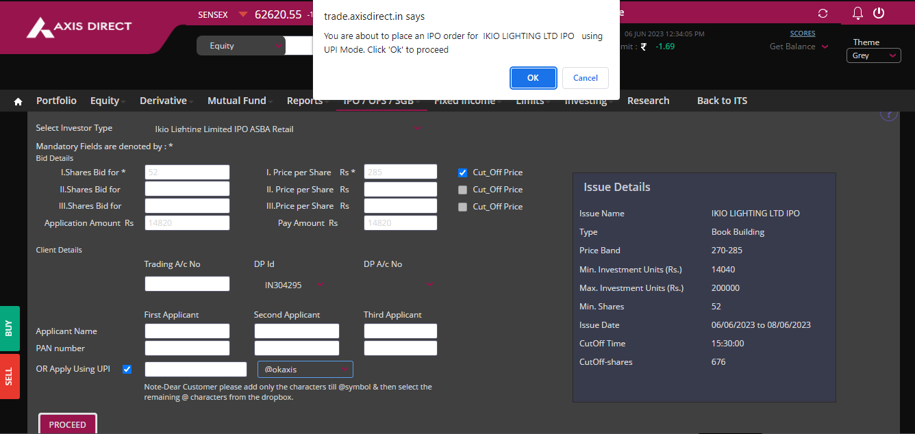 You would receive an Order Confirmation for the UPI mode once you click on ‘PROCEED’ click 'OK' to proceed with the order