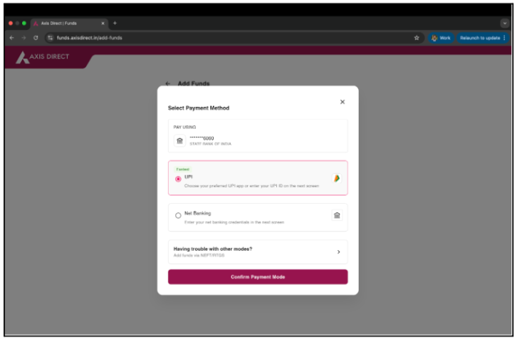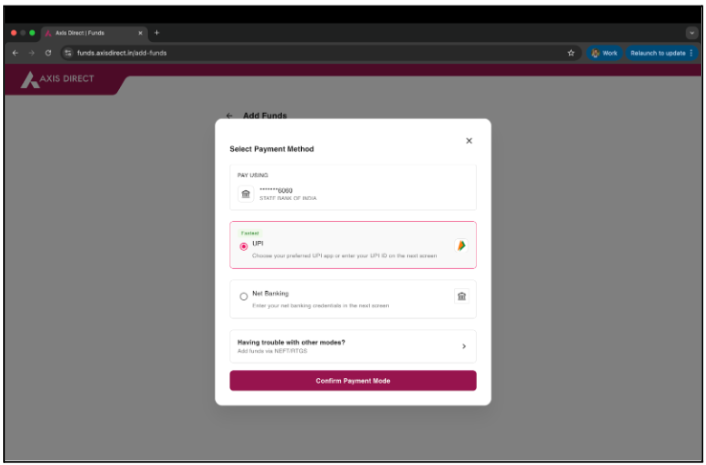 As per the SEBI guidelines, we now introduce official validated UPI Id, where payments are routed only to Axis Securities Ltd. 's verified bank account. Clients can use the facility to add funds through UPI from their registered/linked bank account to their trading account by raising requests through the website or mobile application only.