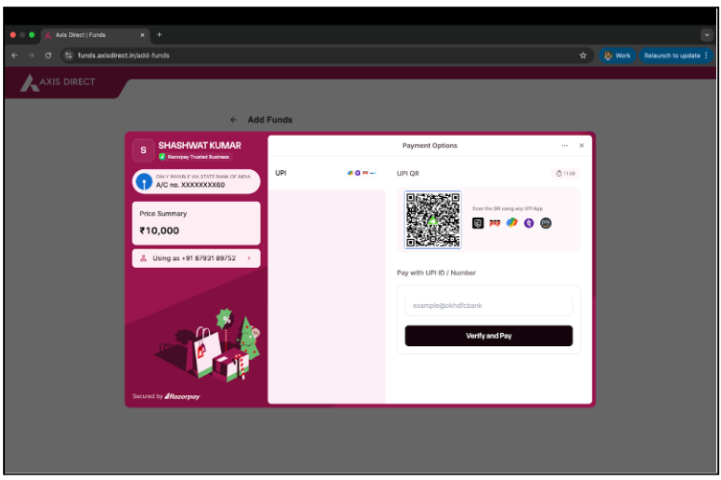 Yes, payments can also be made using the QR code. This feature enables and ensures that financial security is maintained in the best interest of our clients. After the transaction is successfully completed, the “Thumbs-up inside a green triangle” symbol will again confirm that the payment is secure and credited to the Axis Securities verified account.