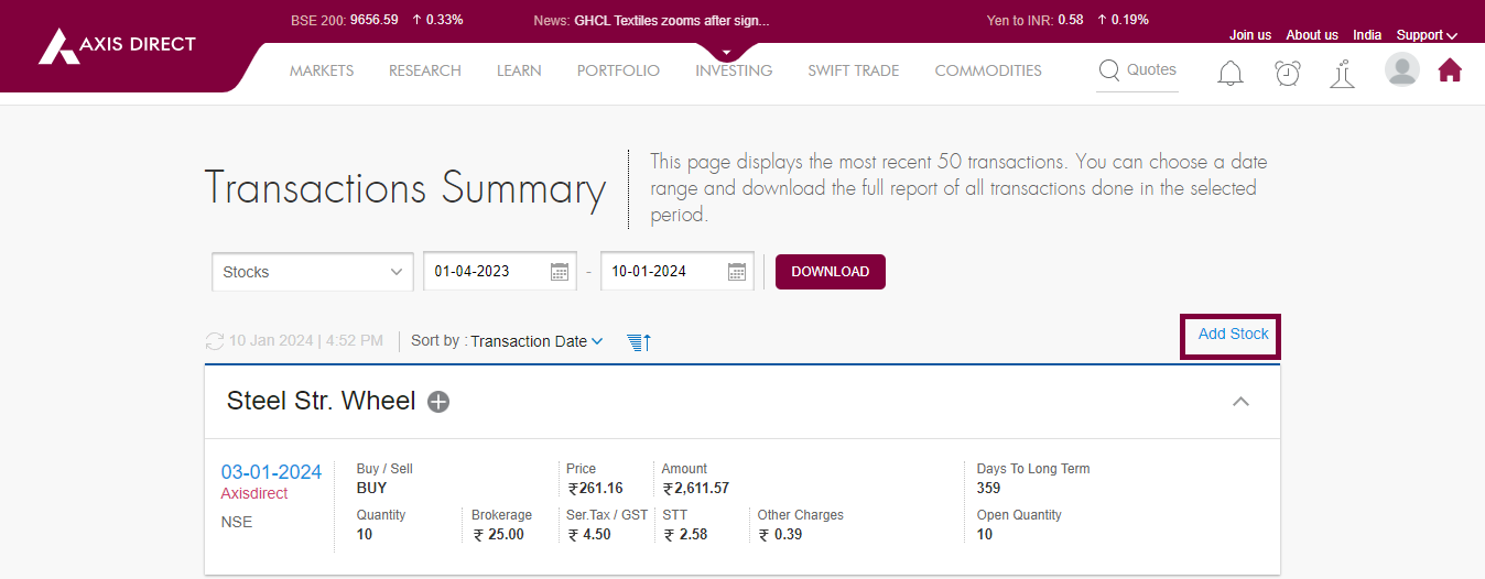 The 'Add Stock' link allows you add stocks to your portfolio manually.